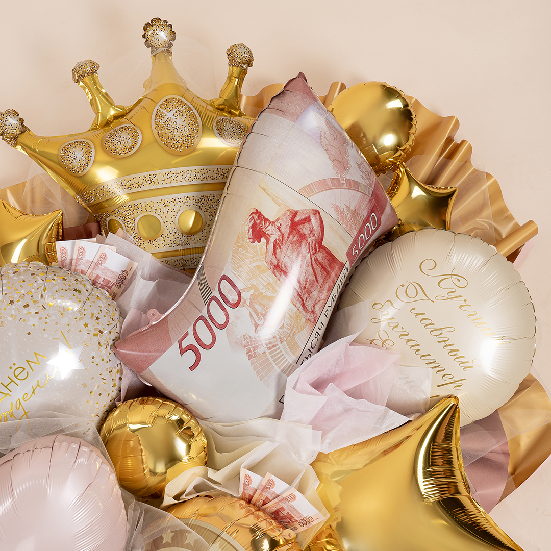 Роскошный букет из фольгированных шаров создаёт атмосферу настоящего праздника и яркого торжества. Великолепная корона, купюра, золотые звёзды и нежное сердце формируют эффектную композицию с нотками гламура и успеха, а объёмная упаковка с декоративным бантом из полисилка делает букет по-настоящему впечатляющим.