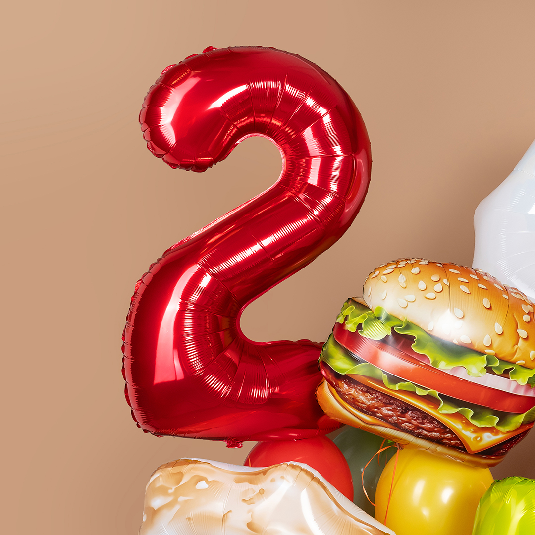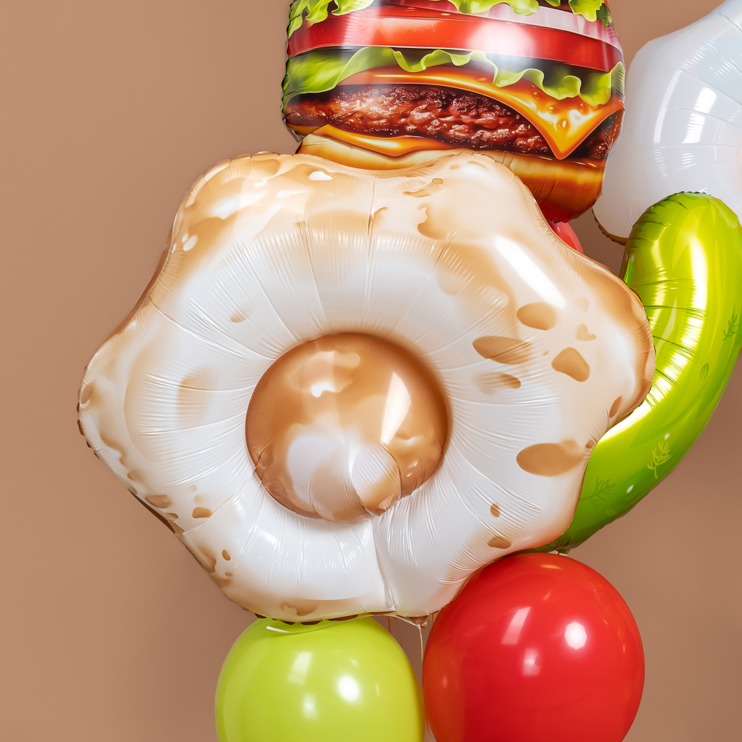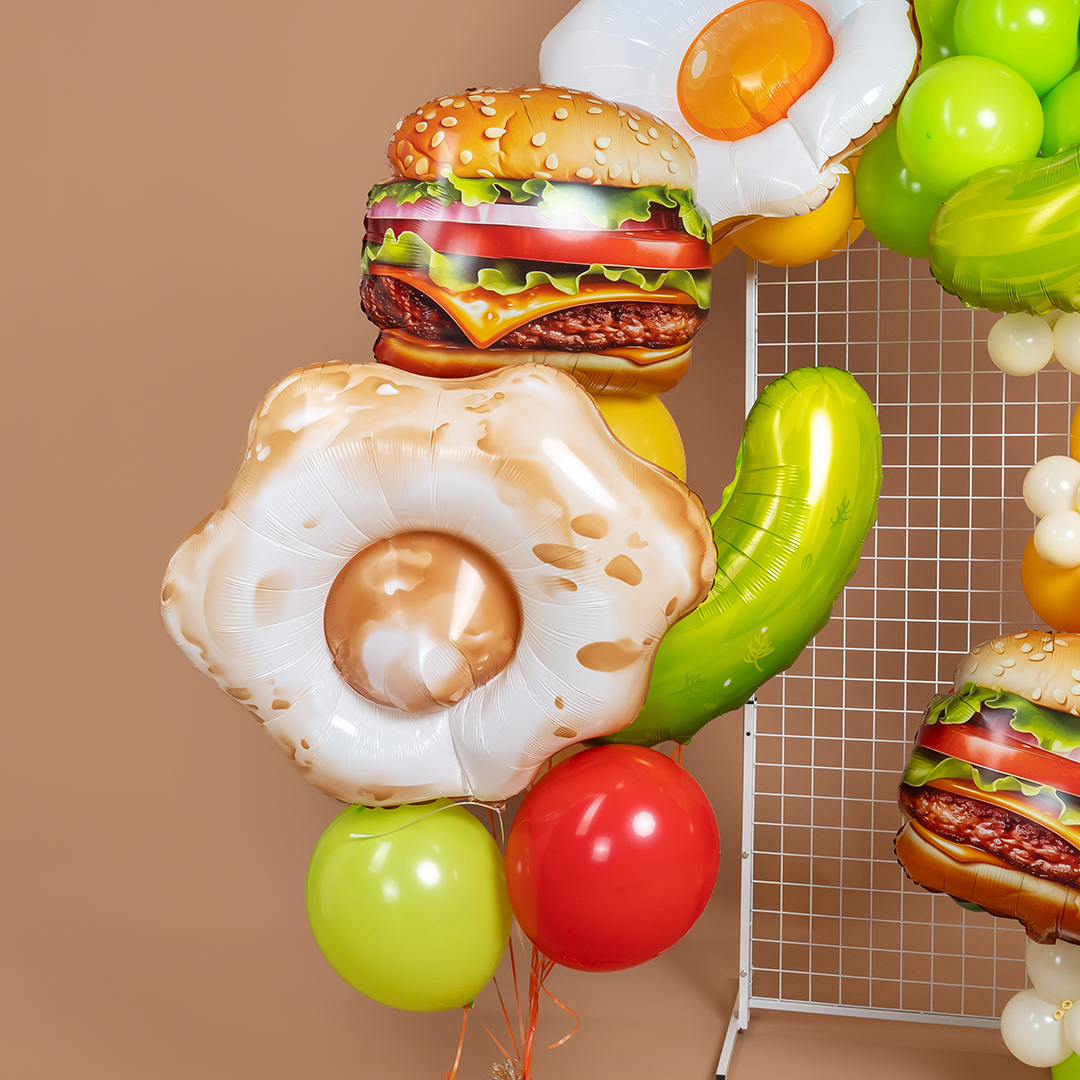 Яркая фотозона с фастфудом создаёт атмосферу драйва, юмора и настоящего гастро-праздника. Объёмные фигуры притягивают внимание и делают оформление эффектным и запоминающимся. Насыщенная цветовая палитра добавляет композиции динамики и современного настроения.