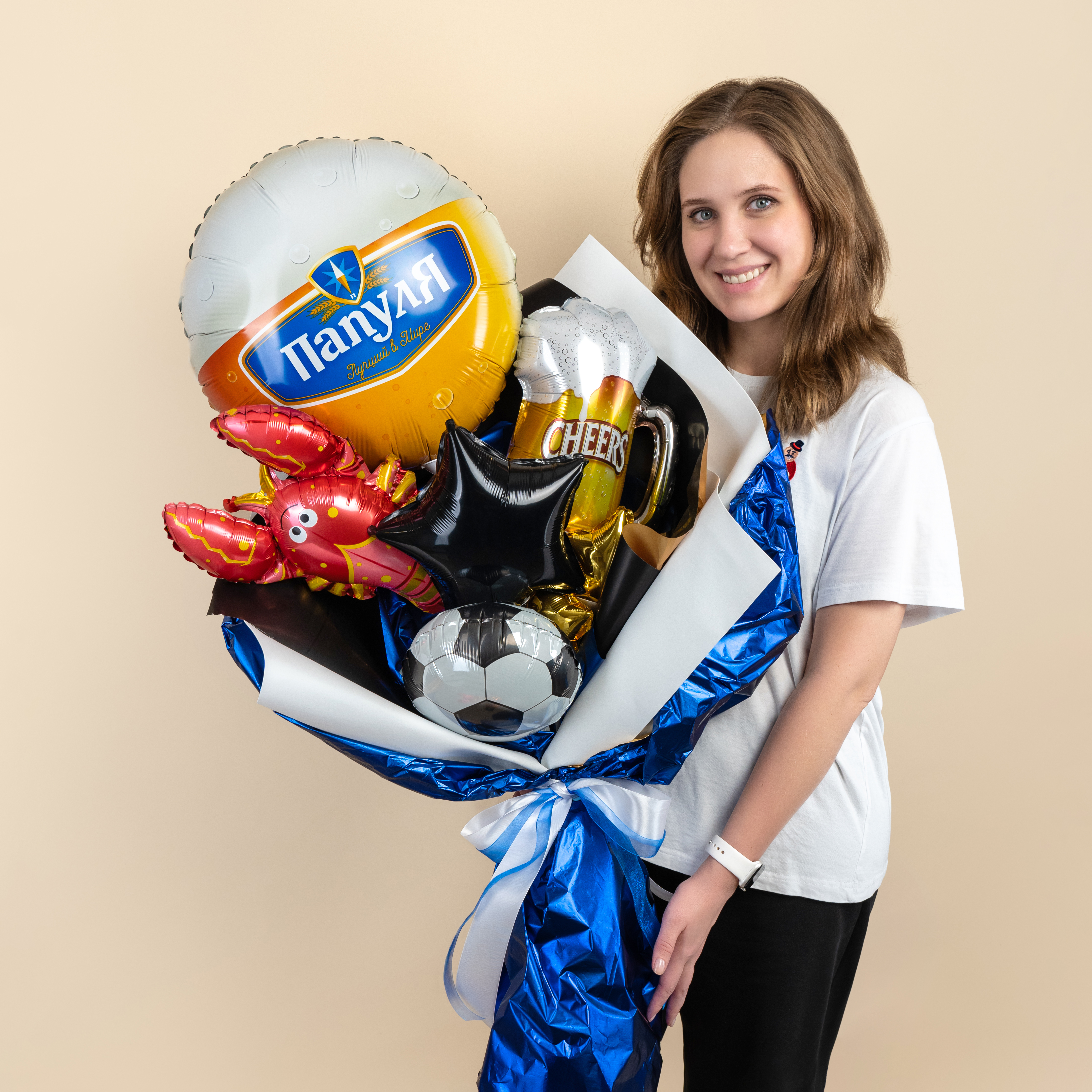 Стильный праздничный букет из фольгированных шаров станет оригинальным подарком для настоящего мужчины и создаст атмосферу яркого праздника. Шар с надписью, эффектная кружка пива, красный рак, футбольный мяч и чёрная звезда формируют выразительную композицию с характером.