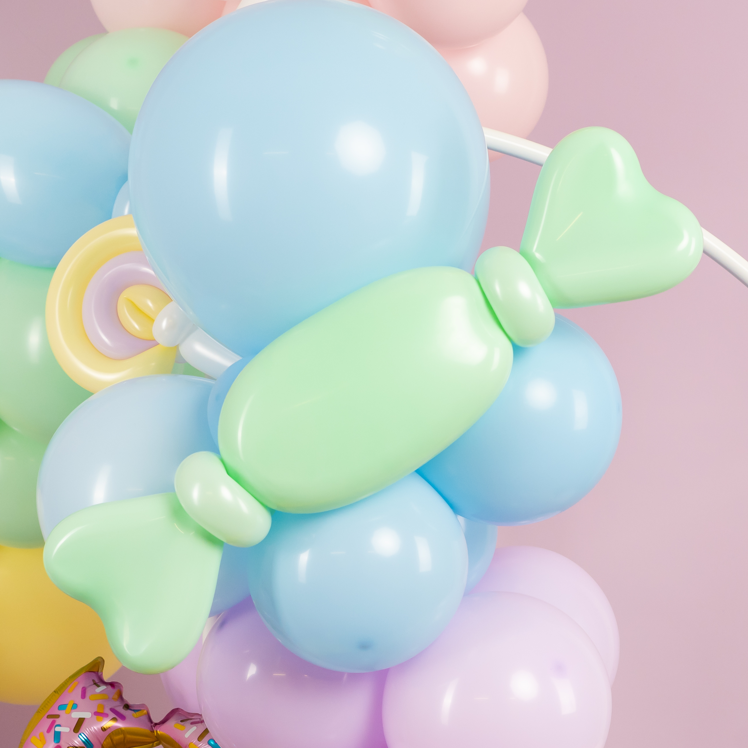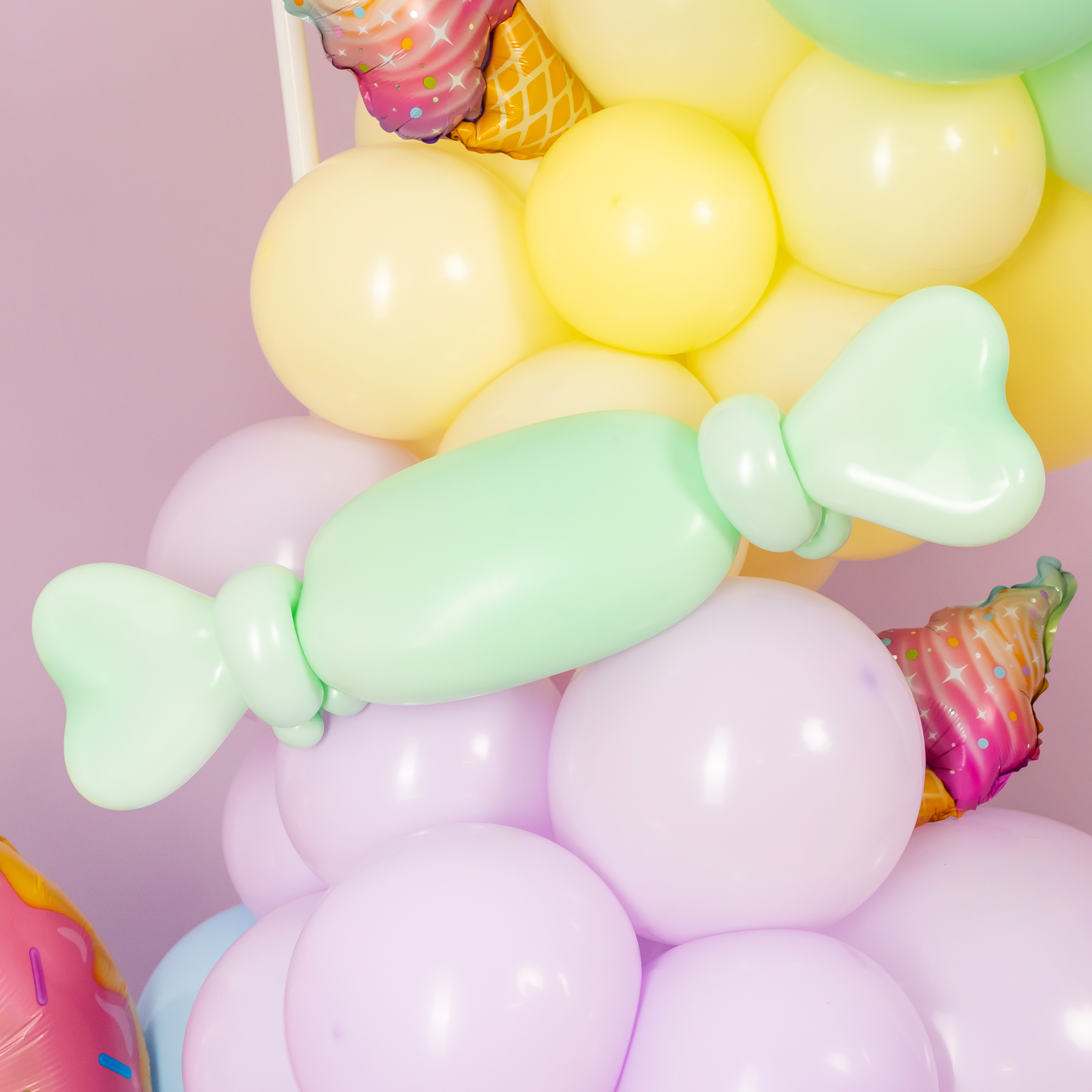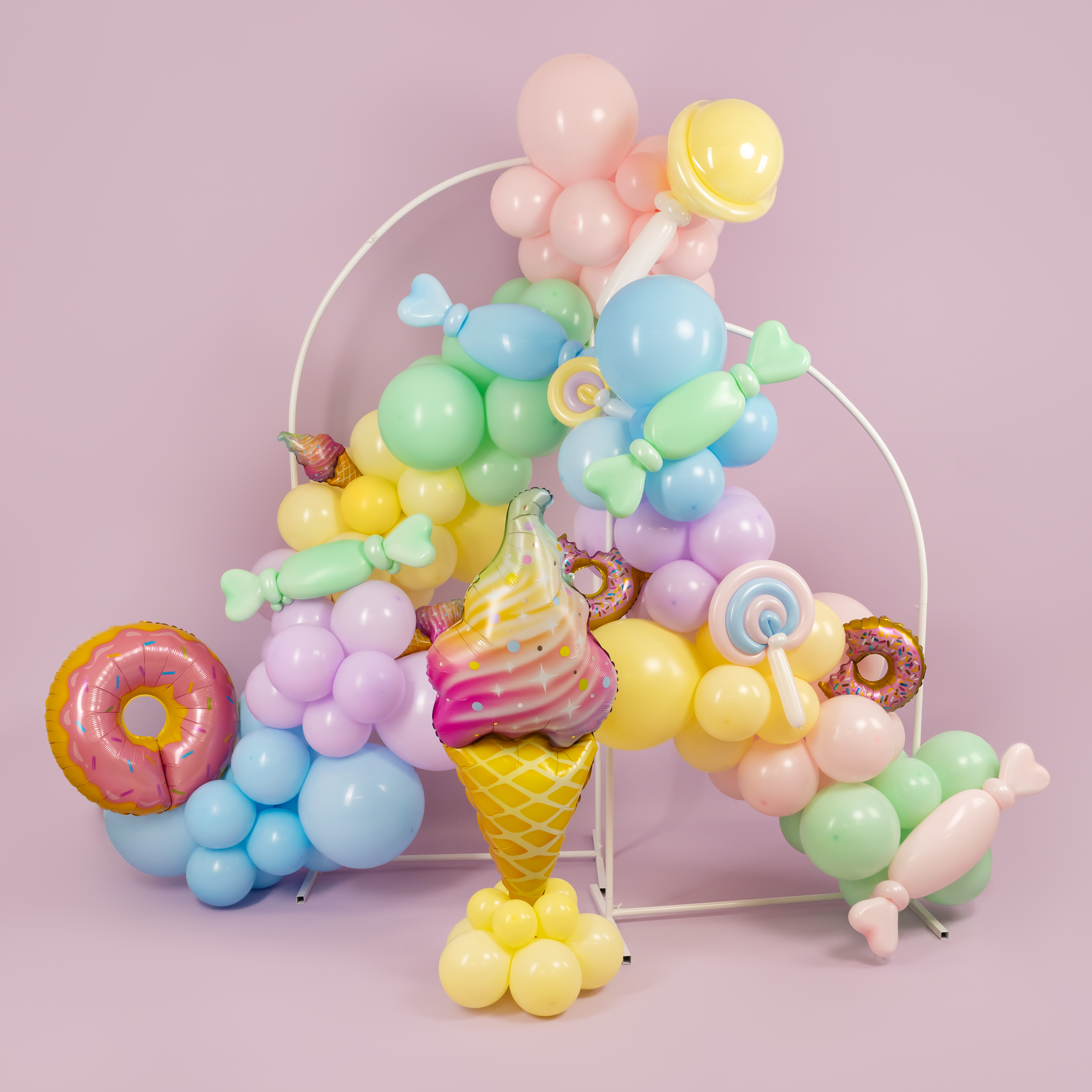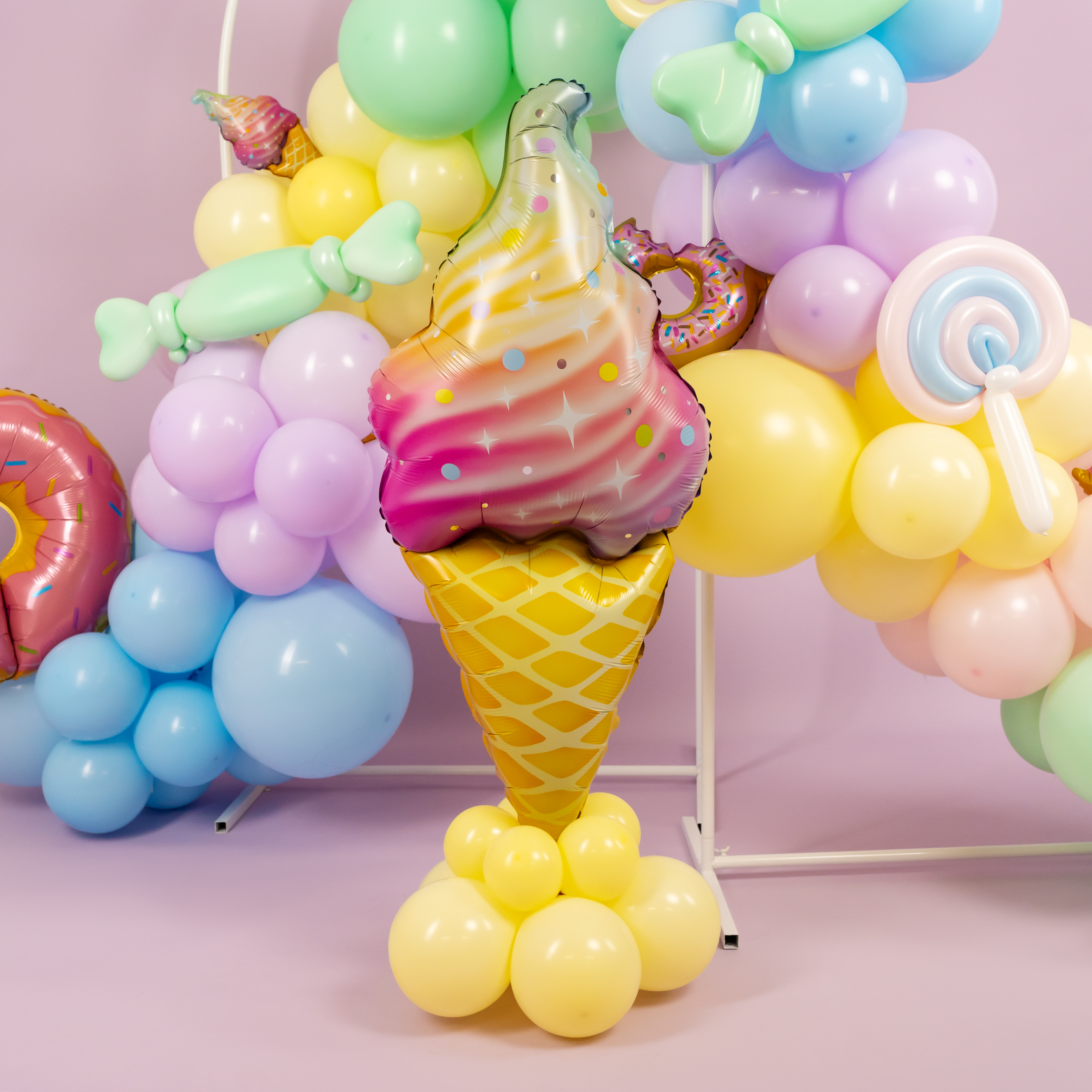 Яркая фотозона в сладком стиле создаёт атмосферу настоящего candy-party и беззаботного праздника. Пастельная палитра, объёмная композиция из шаров, декоративные леденцы, пончики и эффектная фигура мороженого формируют «вкусный» и стильный фон для съёмки.