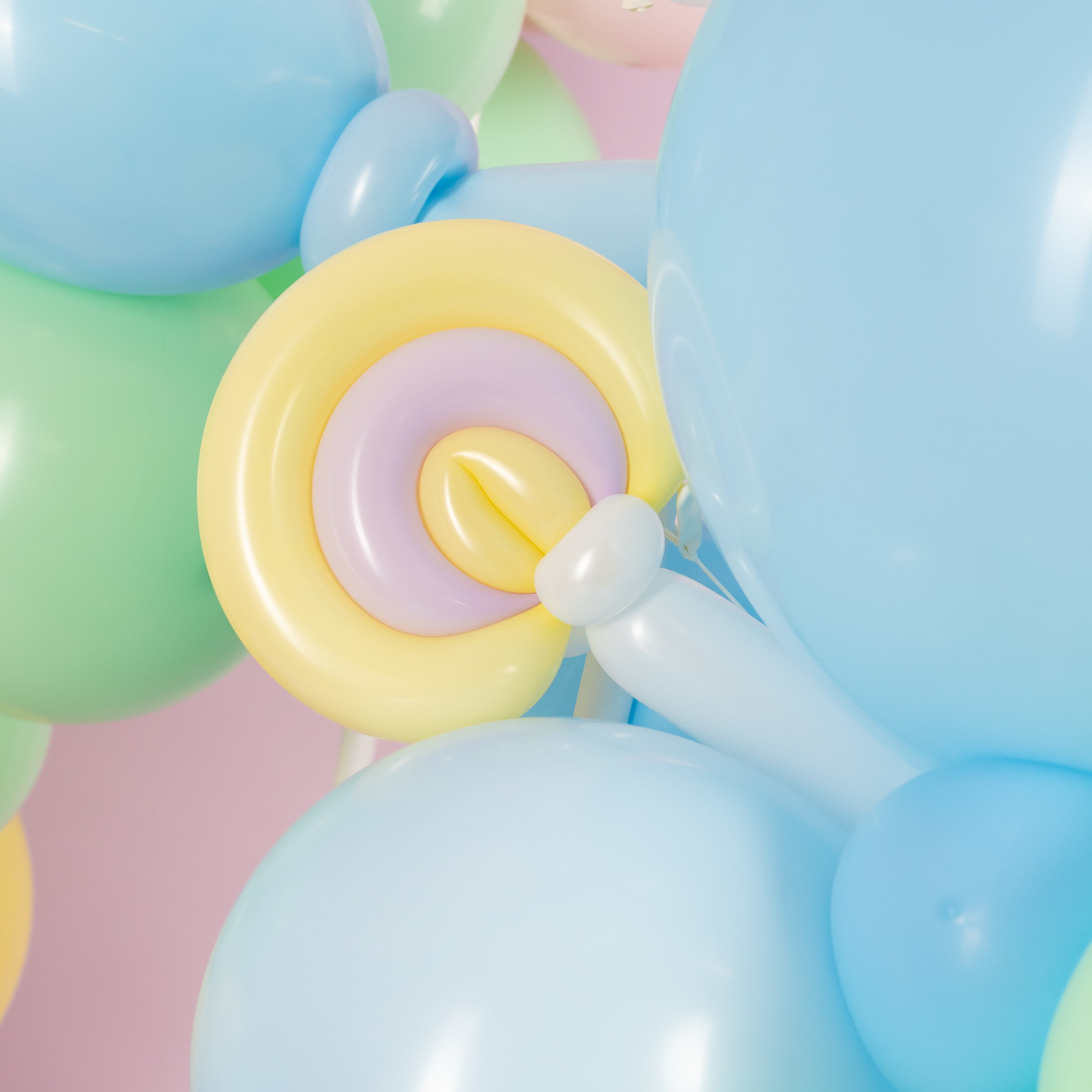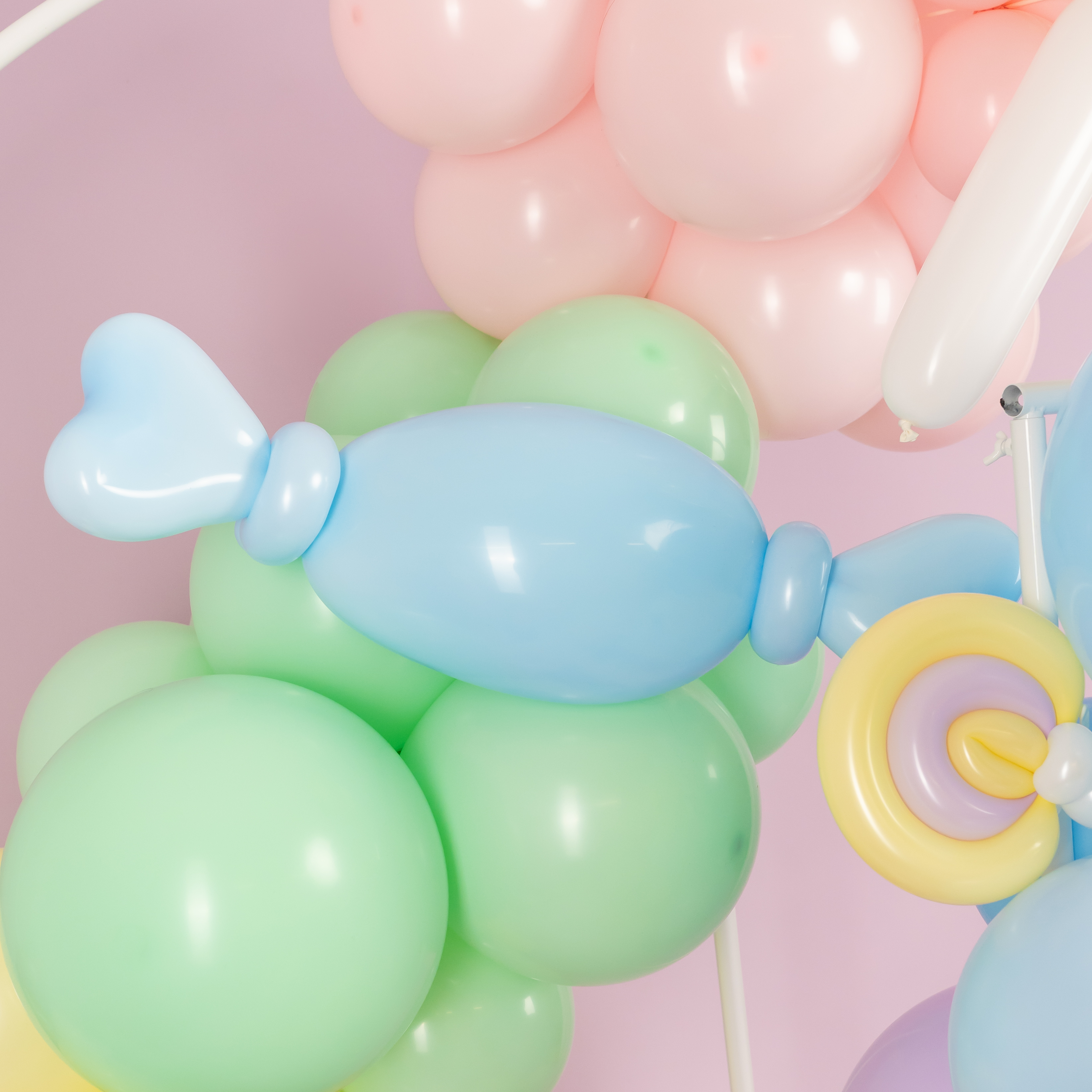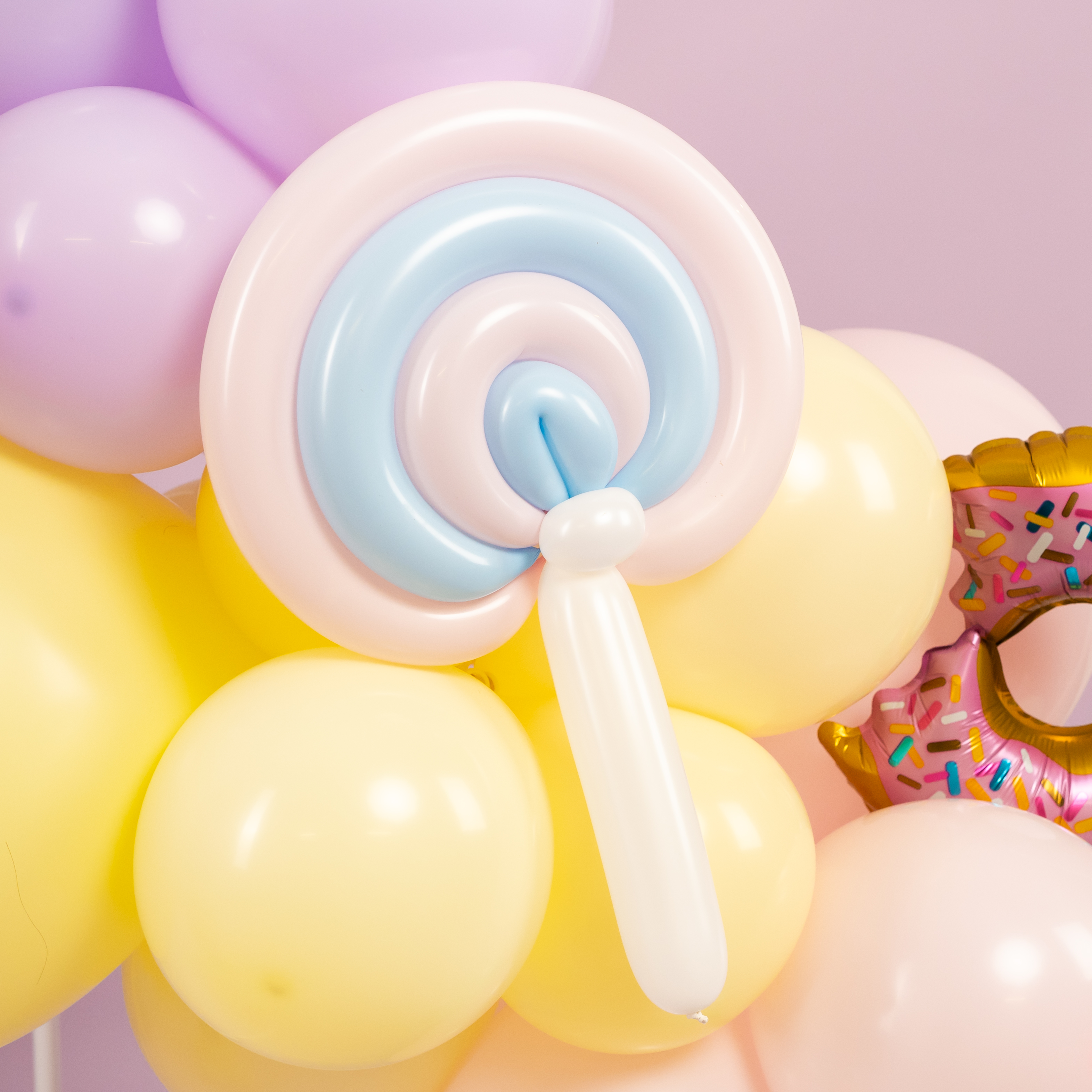 Яркая фотозона в сладком стиле создаёт атмосферу настоящего candy-party и беззаботного праздника. Пастельная палитра, объёмная композиция из шаров, декоративные леденцы, пончики и эффектная фигура мороженого формируют «вкусный» и стильный фон для съёмки.