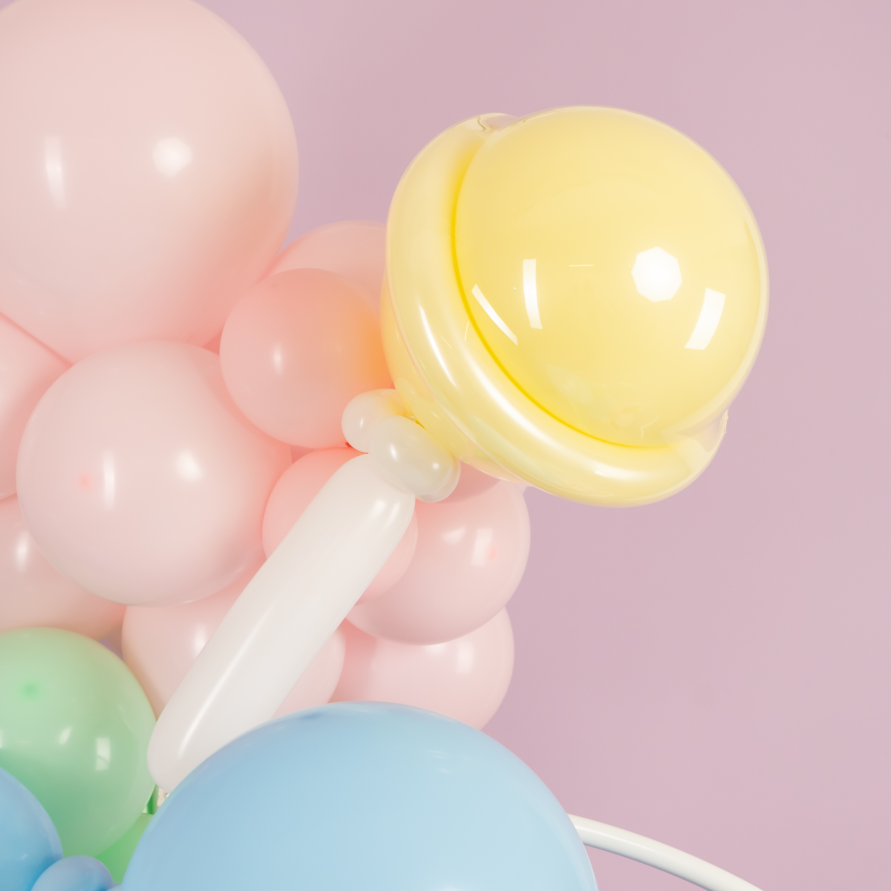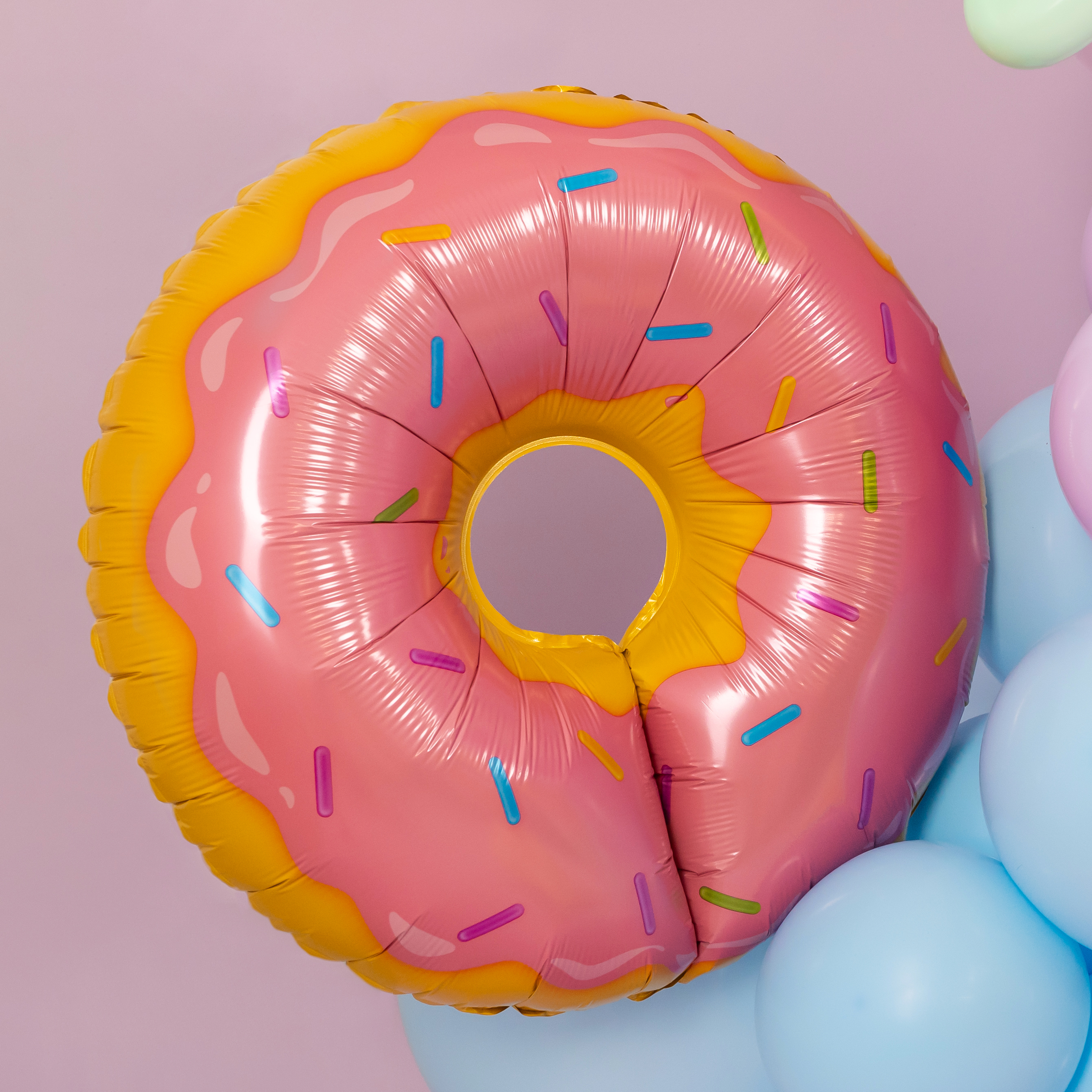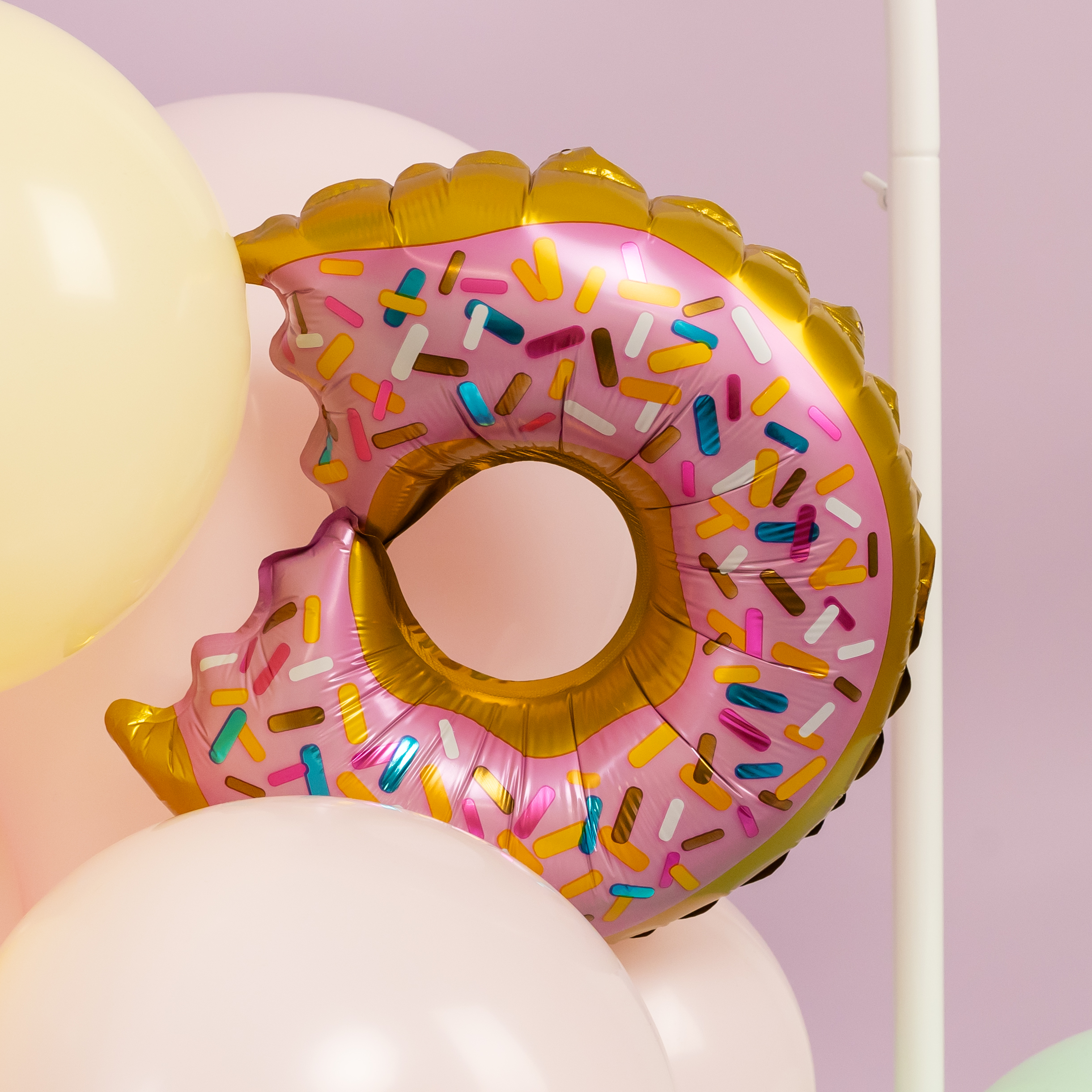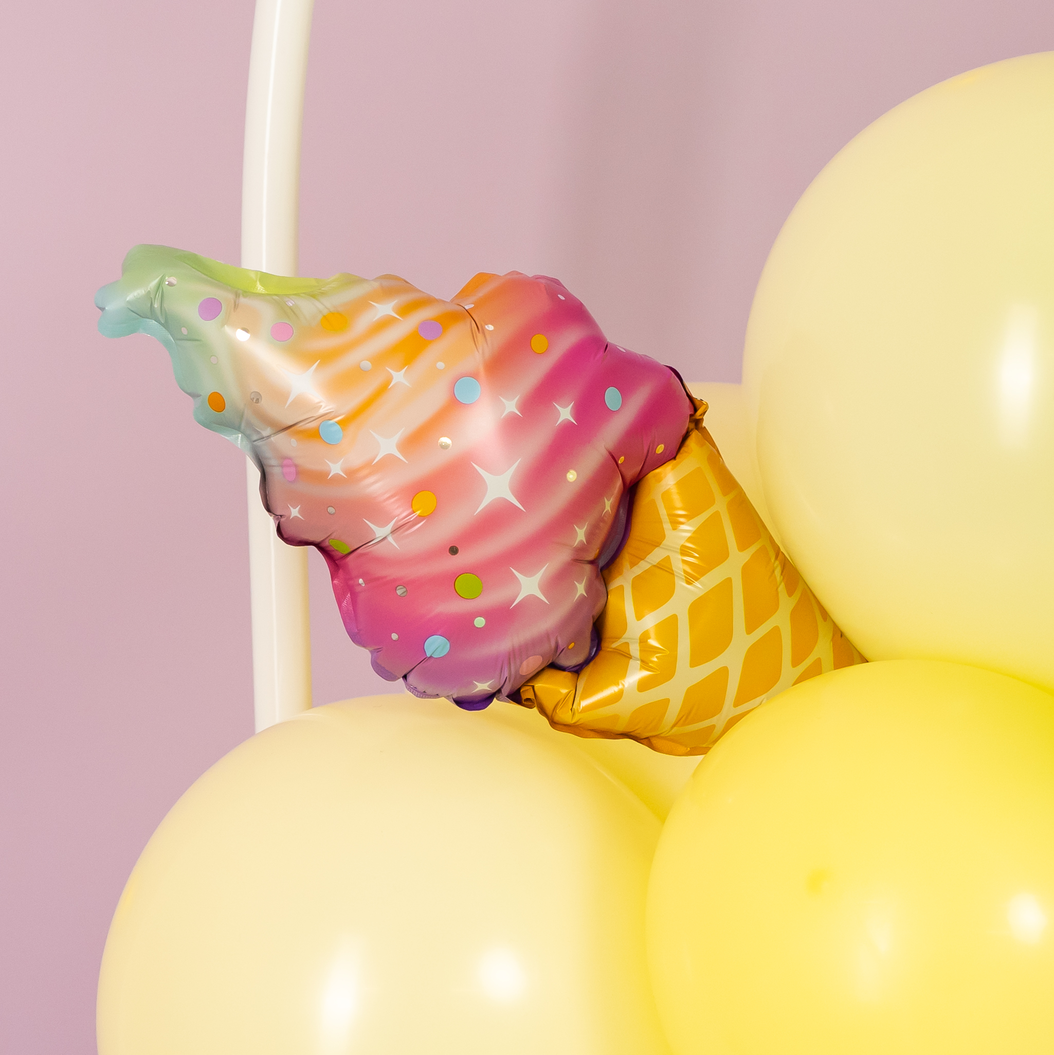 Яркая фотозона в сладком стиле создаёт атмосферу настоящего candy-party и беззаботного праздника. Пастельная палитра, объёмная композиция из шаров, декоративные леденцы, пончики и эффектная фигура мороженого формируют «вкусный» и стильный фон для съёмки.