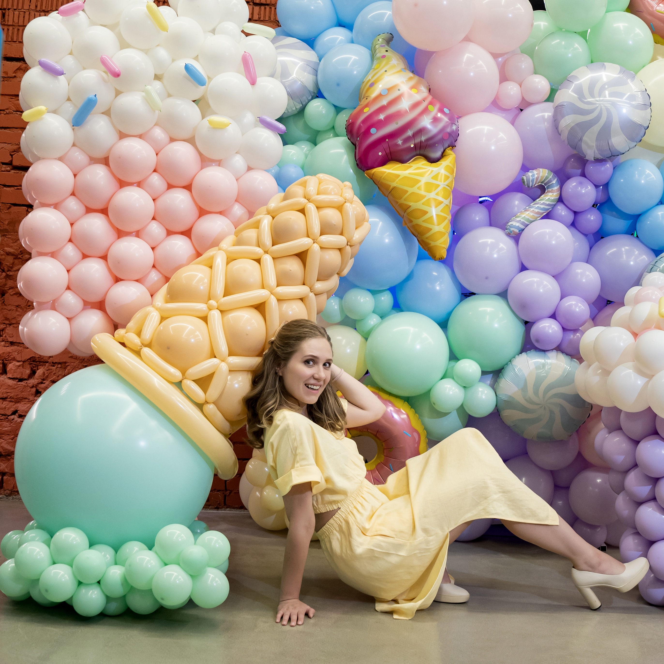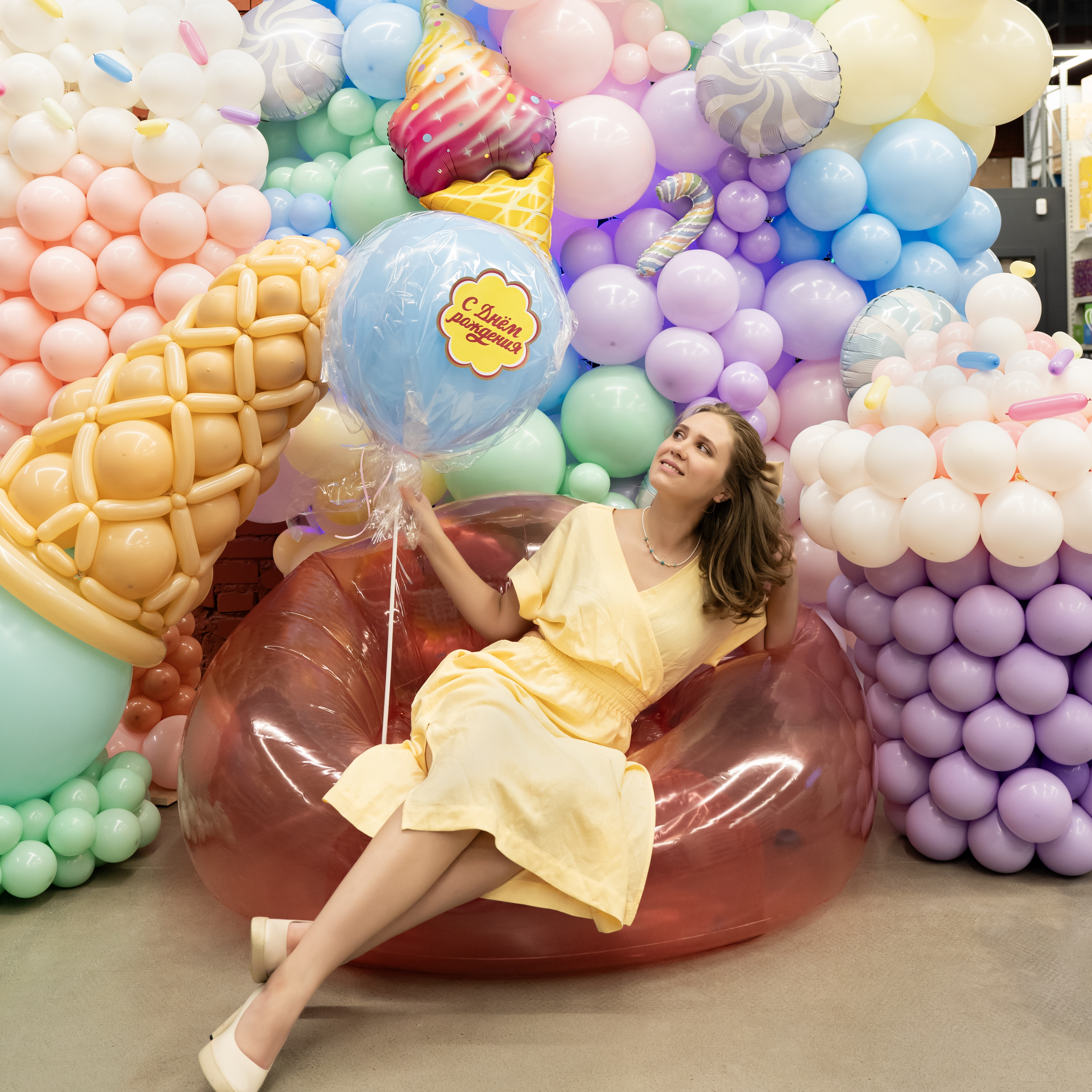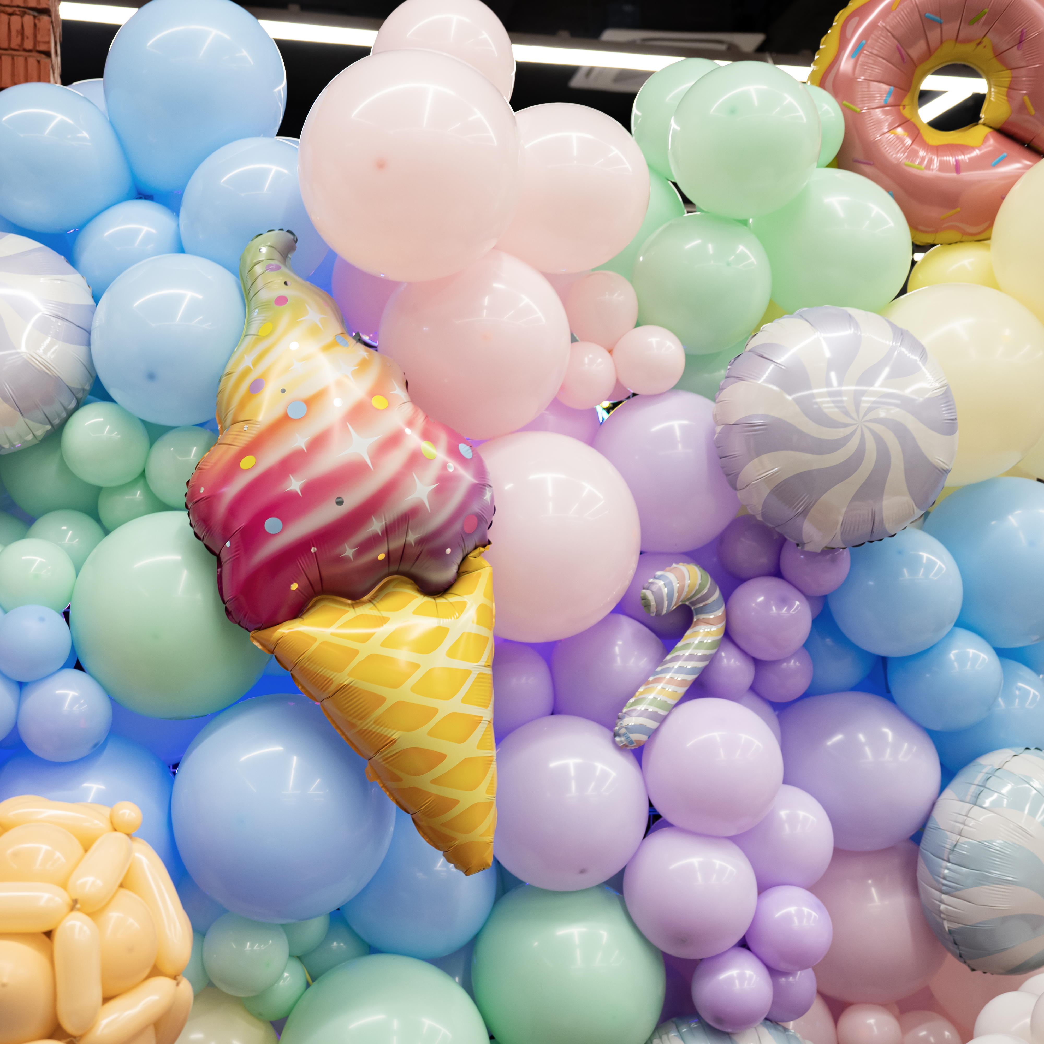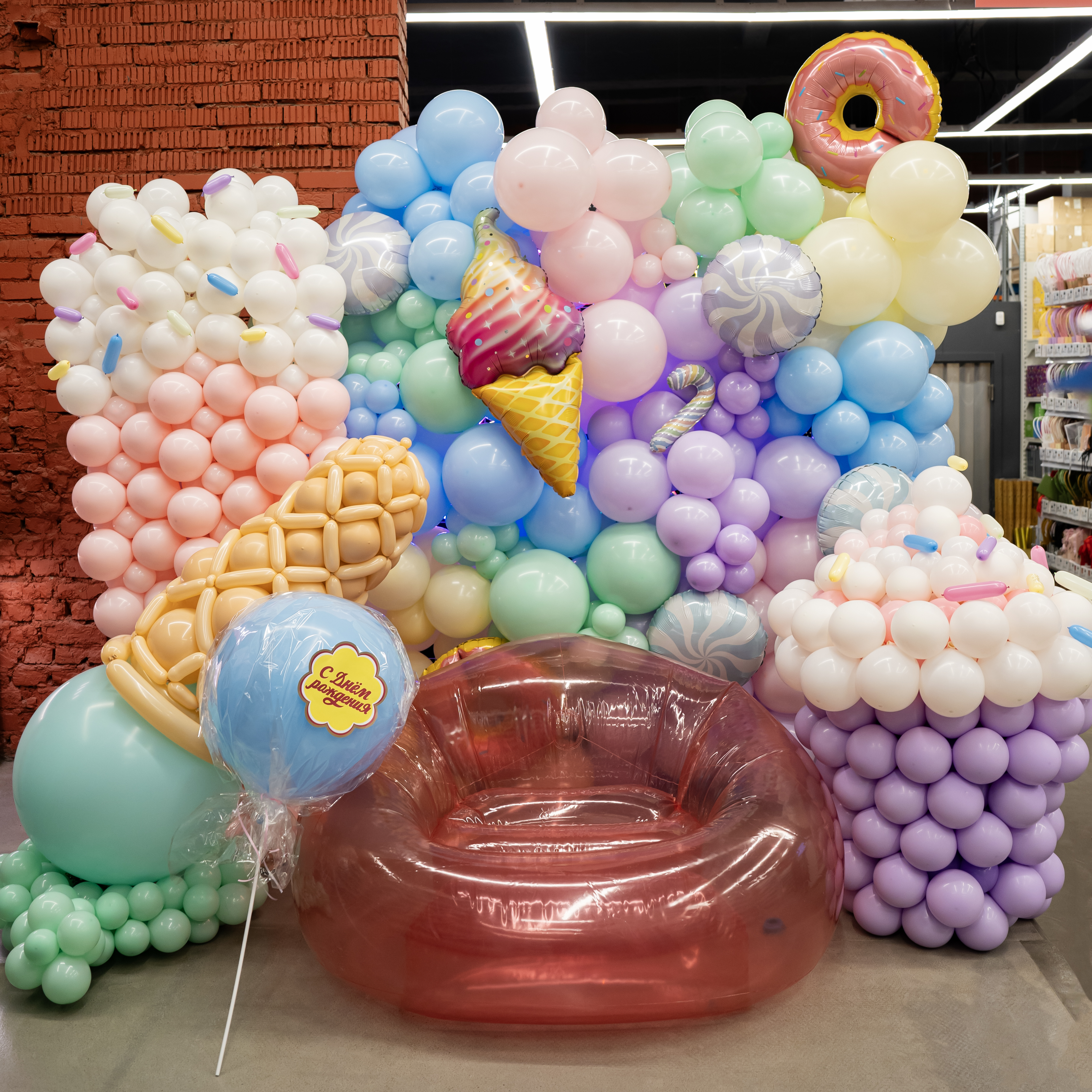 Яркая фотозона со сладостями создаёт атмосферу настоящего candy-party и беззаботного веселья. Объёмные фигуры мороженого в пастельной палитре формируют эффектную и «вкусную» композицию. Фольгированные элементы добавляют блеск и делают оформление по-настоящему праздничным.