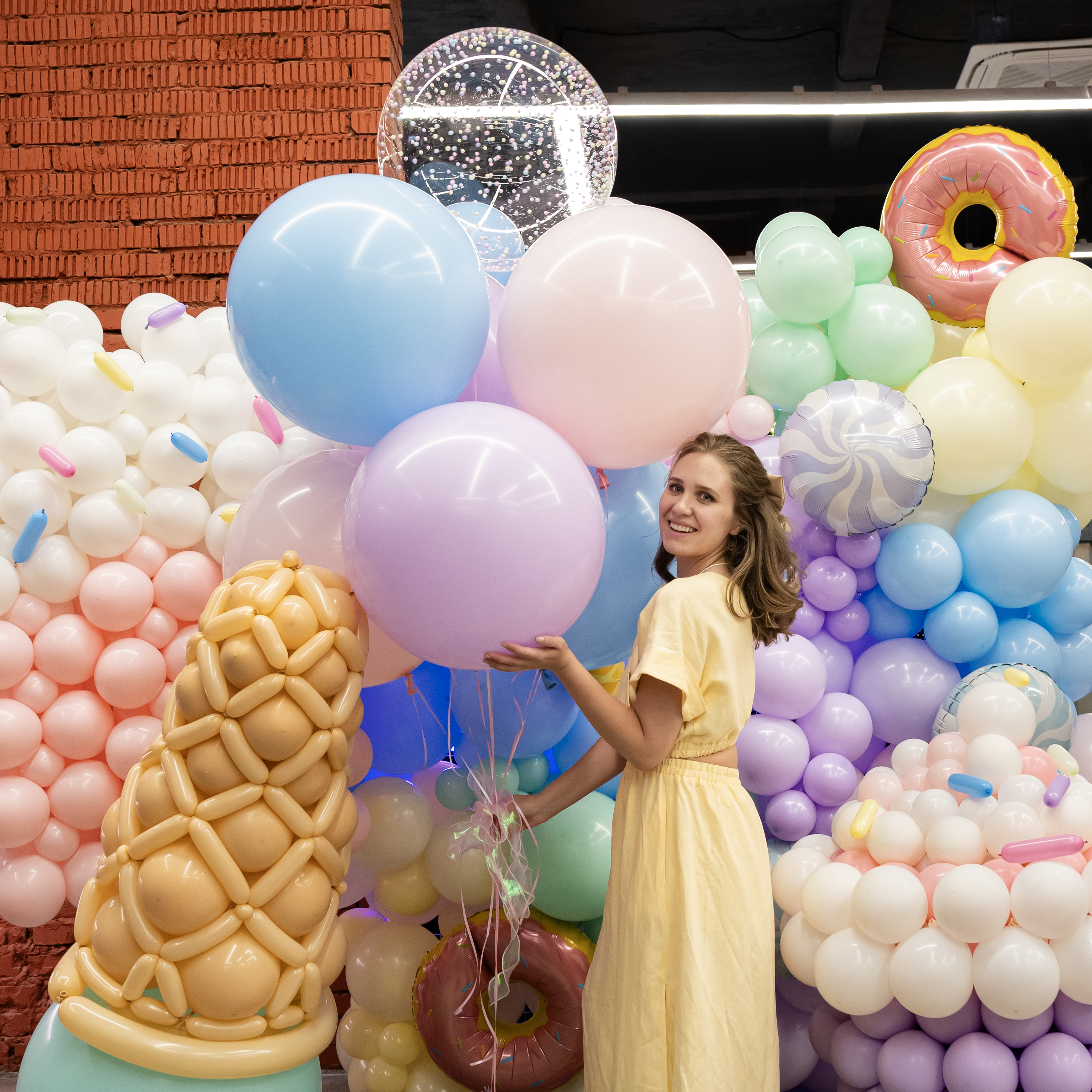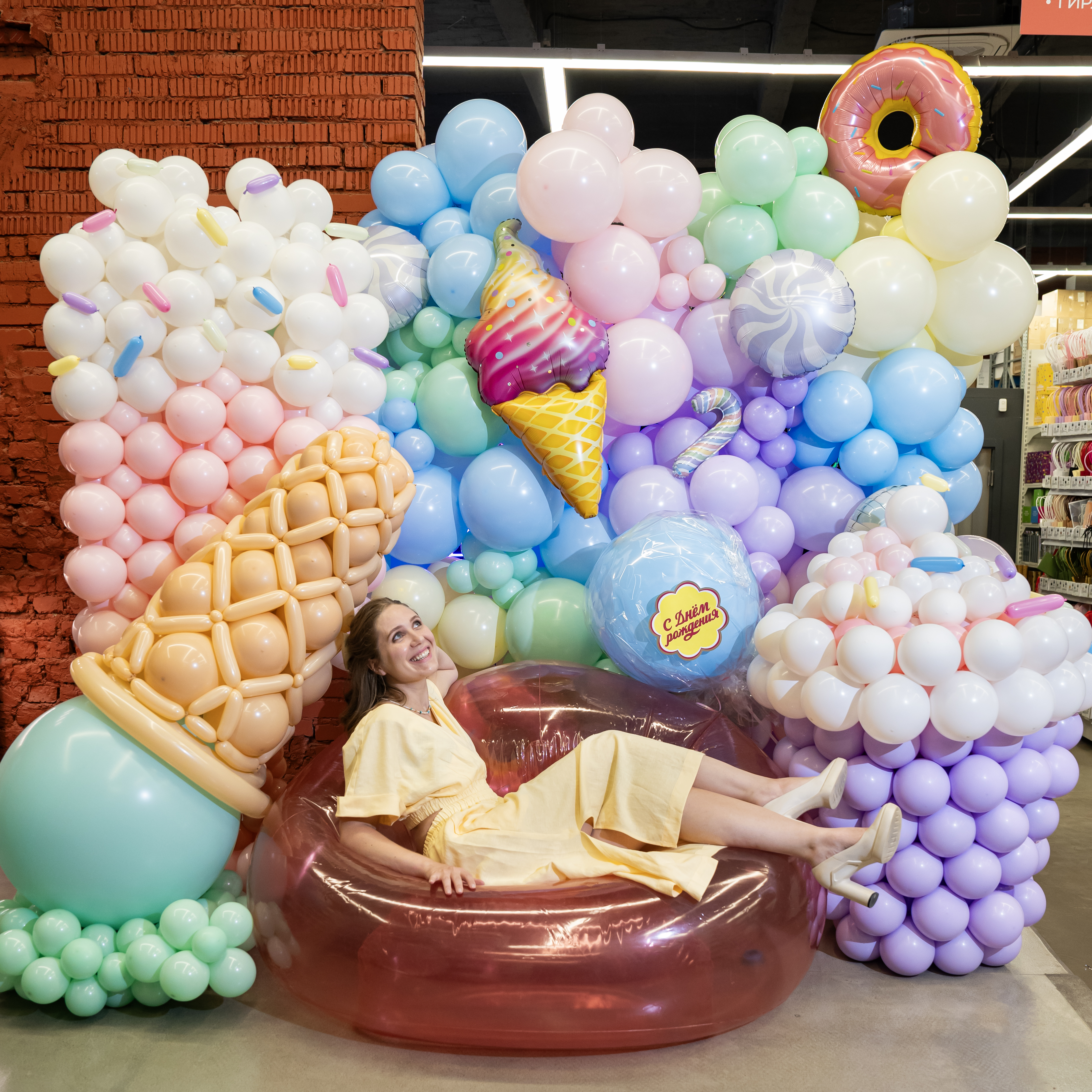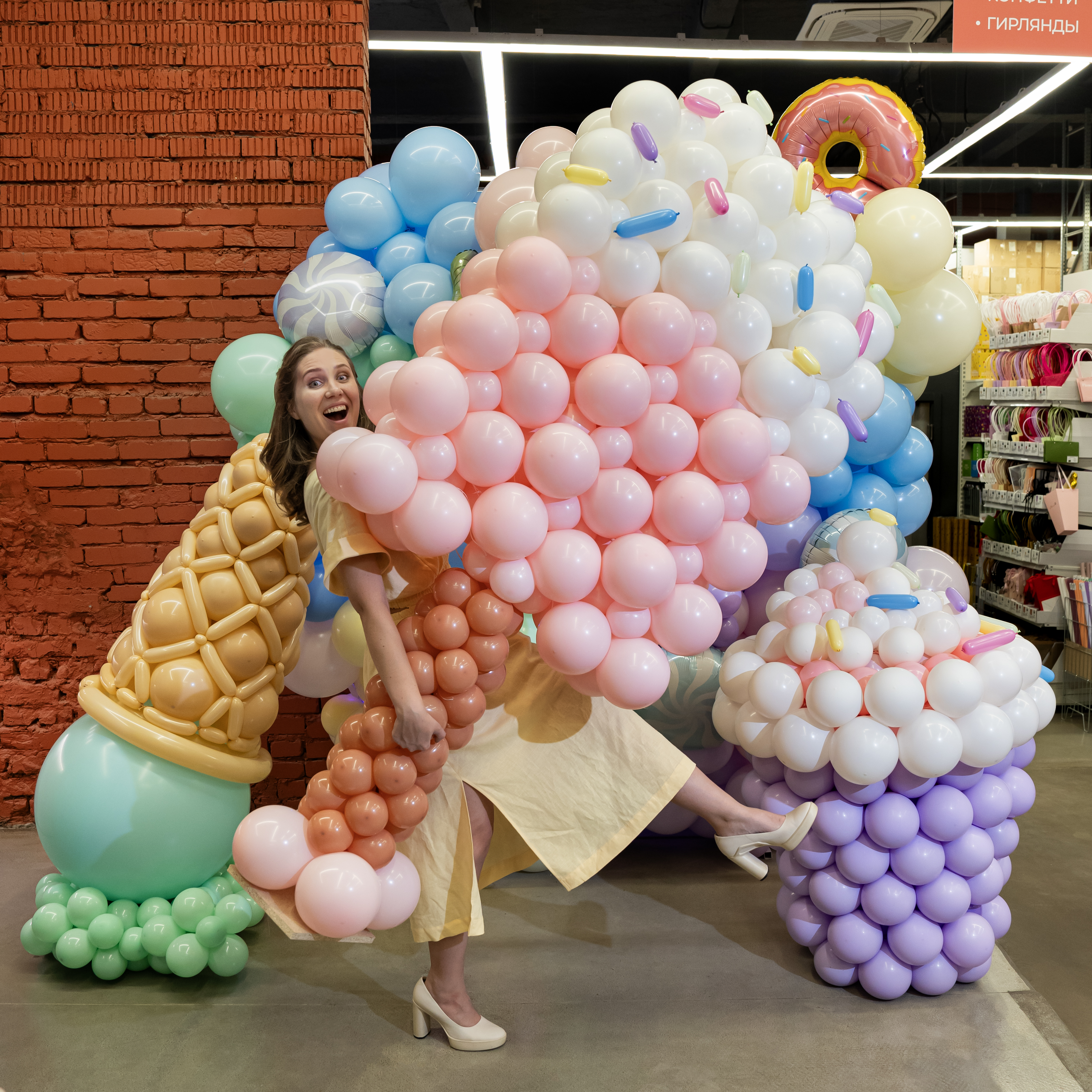 Яркая фотозона со сладостями создаёт атмосферу настоящего candy-party и беззаботного веселья. Объёмные фигуры мороженого в пастельной палитре формируют эффектную и «вкусную» композицию. Фольгированные элементы добавляют блеск и делают оформление по-настоящему праздничным.