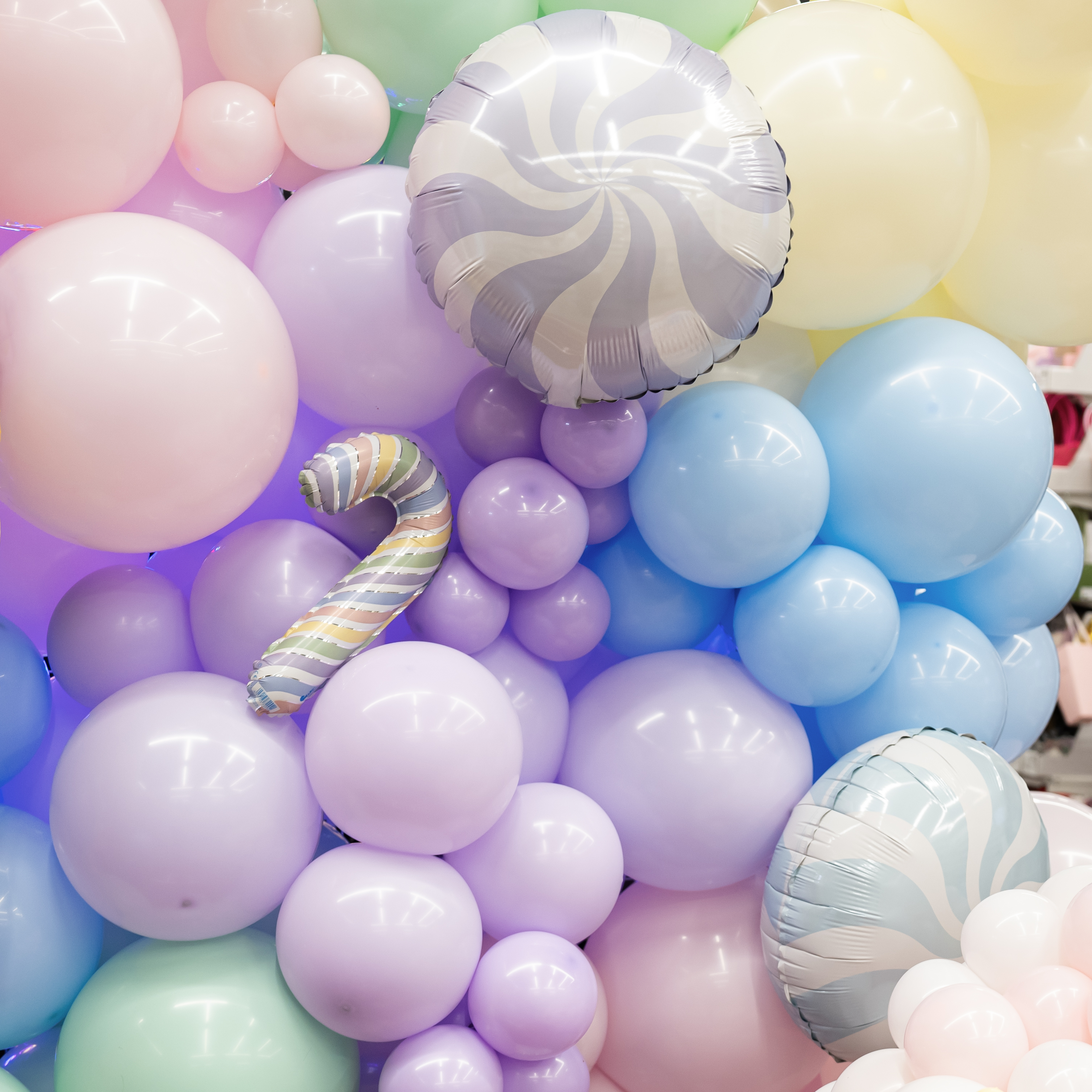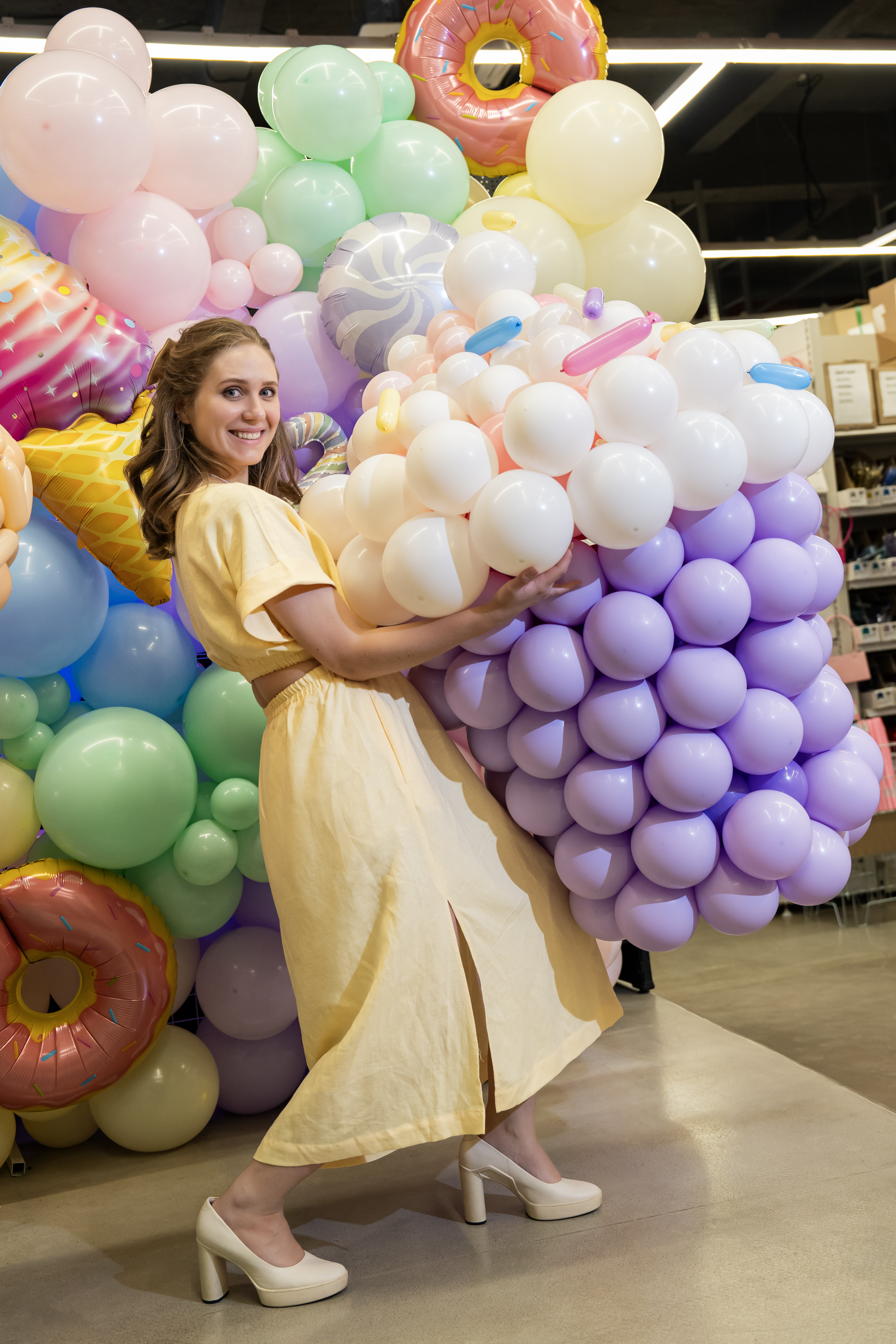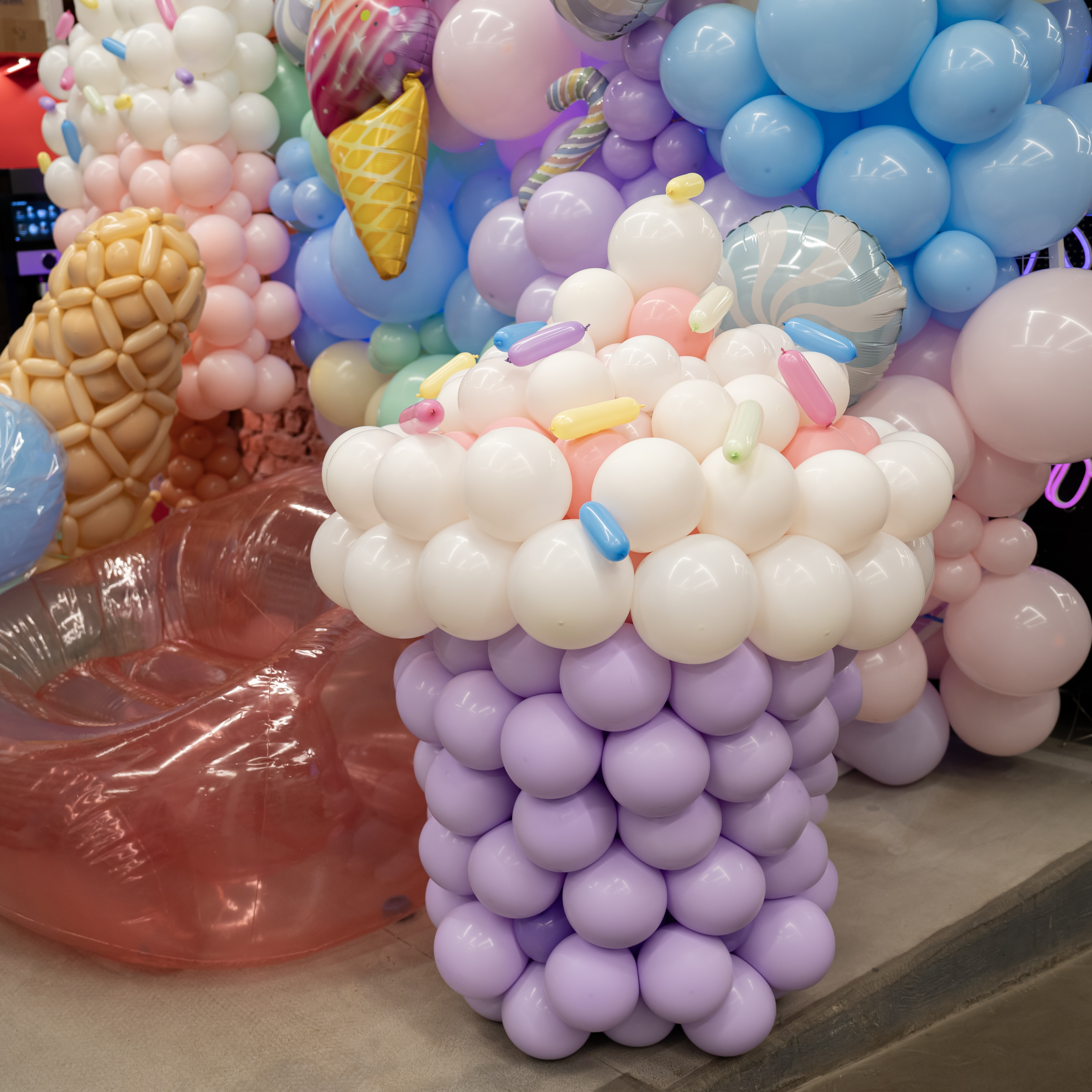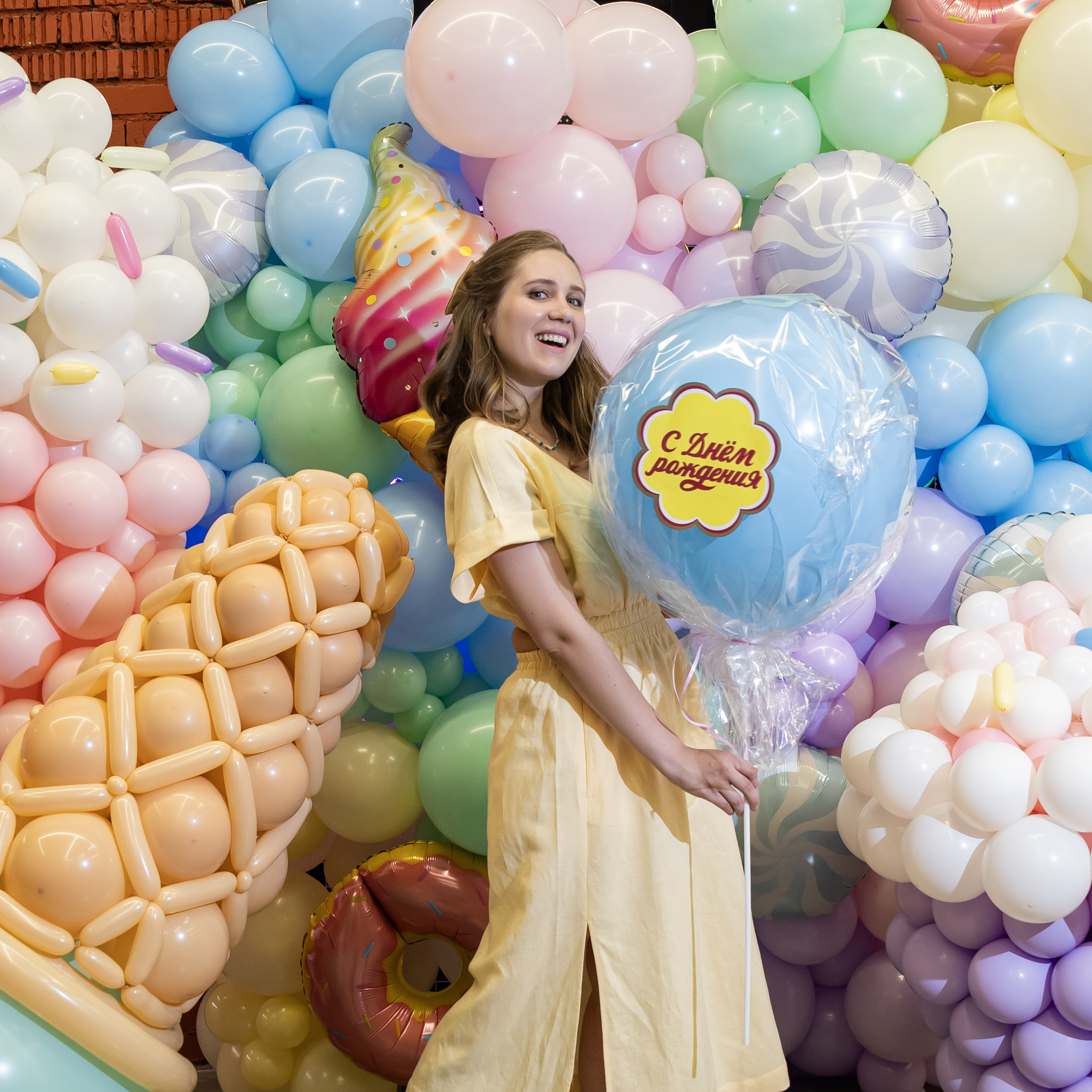 Яркая фотозона со сладостями создаёт атмосферу настоящего candy-party и беззаботного веселья. Объёмные фигуры мороженого в пастельной палитре формируют эффектную и «вкусную» композицию. Фольгированные элементы добавляют блеск и делают оформление по-настоящему праздничным.